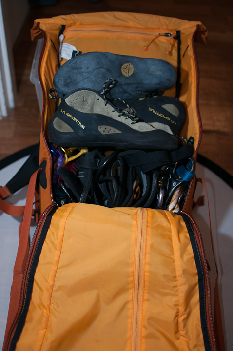 Den sväljer bra för att vara en 30 liters säck. Här med ett tradrack, sele och två skor. Fortfarande plats för lite fika på toppen!