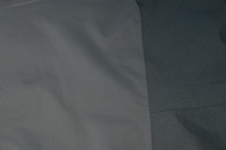 I partiet mellan ryggen och axlarna. Den ljusare väven är den tunnare 129 g/m2 40 denier väven och den mörkare är 166 g/m2 150 denier.