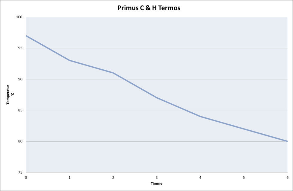 Direkt från grytan, innan korken skruvas på första gången, är vattnet i termosen 97 grader varmt. Efter 3 timmar har det sjunkit 10 grader och är nere på 87. Efter ytterligare 3 timmar så har vattnets temperatur sjunkit till 80 grader. Efter 15 timmar så var temperaturen nere i 63 grader. Som synes så är temperaturminskningen i termosen ganska linjär. De fösta 6 timmarna så minskar den nästan 3 grader per timme. Över 15 timmar så är det lite drygt 2 grader per timme.
