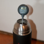 För att testa hur väl den håller värmen började jag med förvärma termosen med kokande vatten i 15 minuter för att sedan koka upp vattnet igen och fylla termosen så den var helt full. Testet gjordes med 0,75 liters varianten och den vanliga skruvkorken eftersom den skall ha den bästa isoleringen. Sedan förvarades termosen i ett kylskåp där temperaturen låg mellan 4-6 grader under testet. En gång i timmen togs den ut för att mäta temperaturen på vattnet.